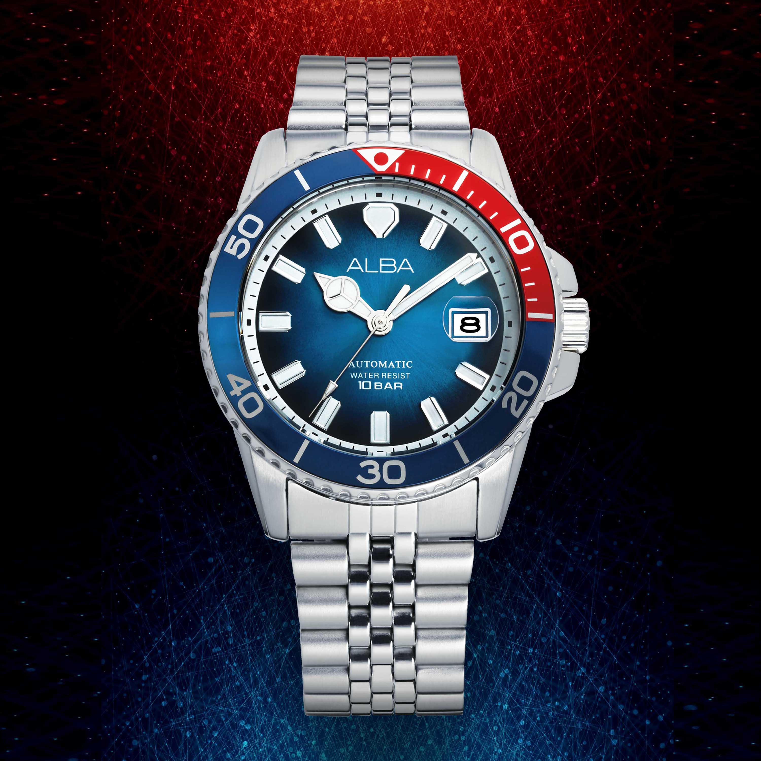 The latest ALBA Active sports watch series introduces an authentic diver-inspired design featuring the iconic blue and red two-color aluminium plate bezel, which is bold and eye-catching but without being overly ostentatious. Embodying the spirit of travel and a sense of exploration, this sport-chic marine influenced design is captivating in style, exuding a sophisticated masculinity in a modern and adventurous silhouette that appeals to both sports enthusiasts and active adventure seekers alike. This exciting new timepiece is powered by the Caliber Y675 automatic mechanical movement with a 41-hour power reserve and is energized by the motion of your wrist with no need for battery change, in keeping with the trending desire and advocacy for sustainable development and environmental protection. Crafted to high quality standards, this cool design is set in a 42.5mm diameter case with a transparent case back to reveal the inner workings of the mechanical movement. Paired with a “jubilee-style” stainless steel bracelet with the timeless interlocking links which is elegant and flexible, this exciting design will strike a chord in the hearts and minds of people who aspire to an active and adventurous lifestyle, making it highly wearable for all type of occasions.